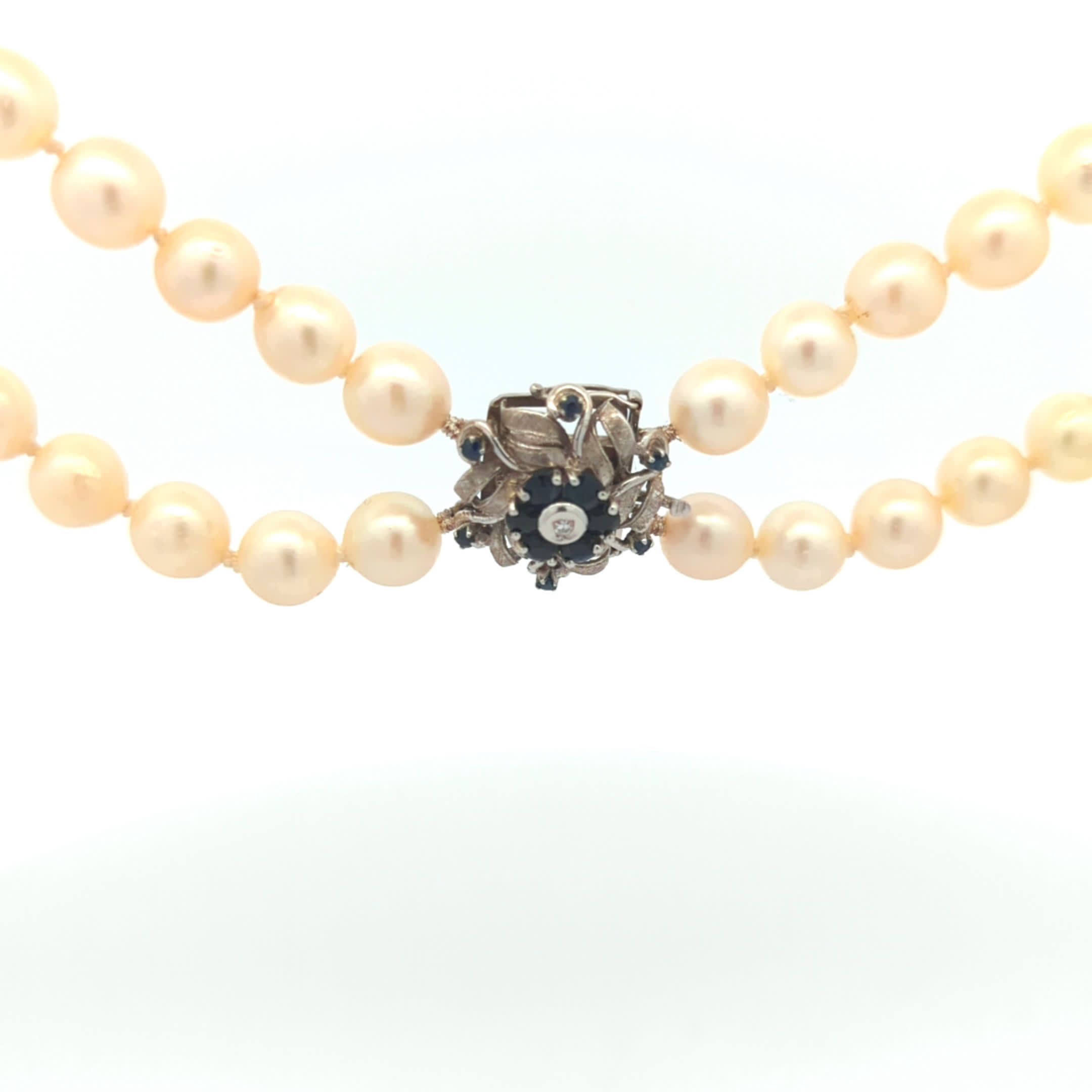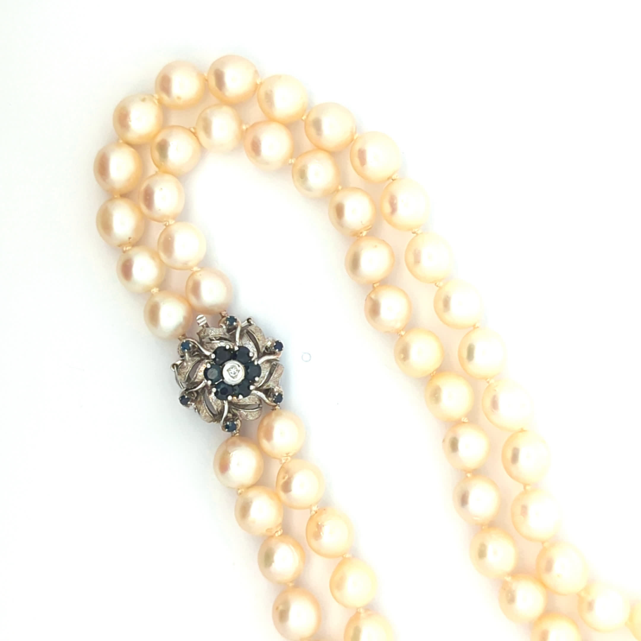 Lassen Sie sich von der zeitlosen Eleganz unserer zweireihigen Perlenkette verzaubern. Diese exquisite Kette besteht aus 71 sorgfältig ausgewählten Perlen mit einem Durchmesser von 7,7 mm bis 8,2 mm, die in zwei Reihen angeordnet sind und einen wunderschönen, harmonischen Look erzeugen. Die raffinierte Schließe aus 585er Weißgold ist ein wahres Highlight, geschmückt mit funkelnden blauen Farbsteinen und einem strahlenden Diamanten, der dem Schmuckstück einen Hauch von Luxus verleiht. Mit einer Länge von 43 cm ist diese Perlenkette perfekt für besondere Anlässe oder um Ihrem Outfit eine elegante Note zu verleihen