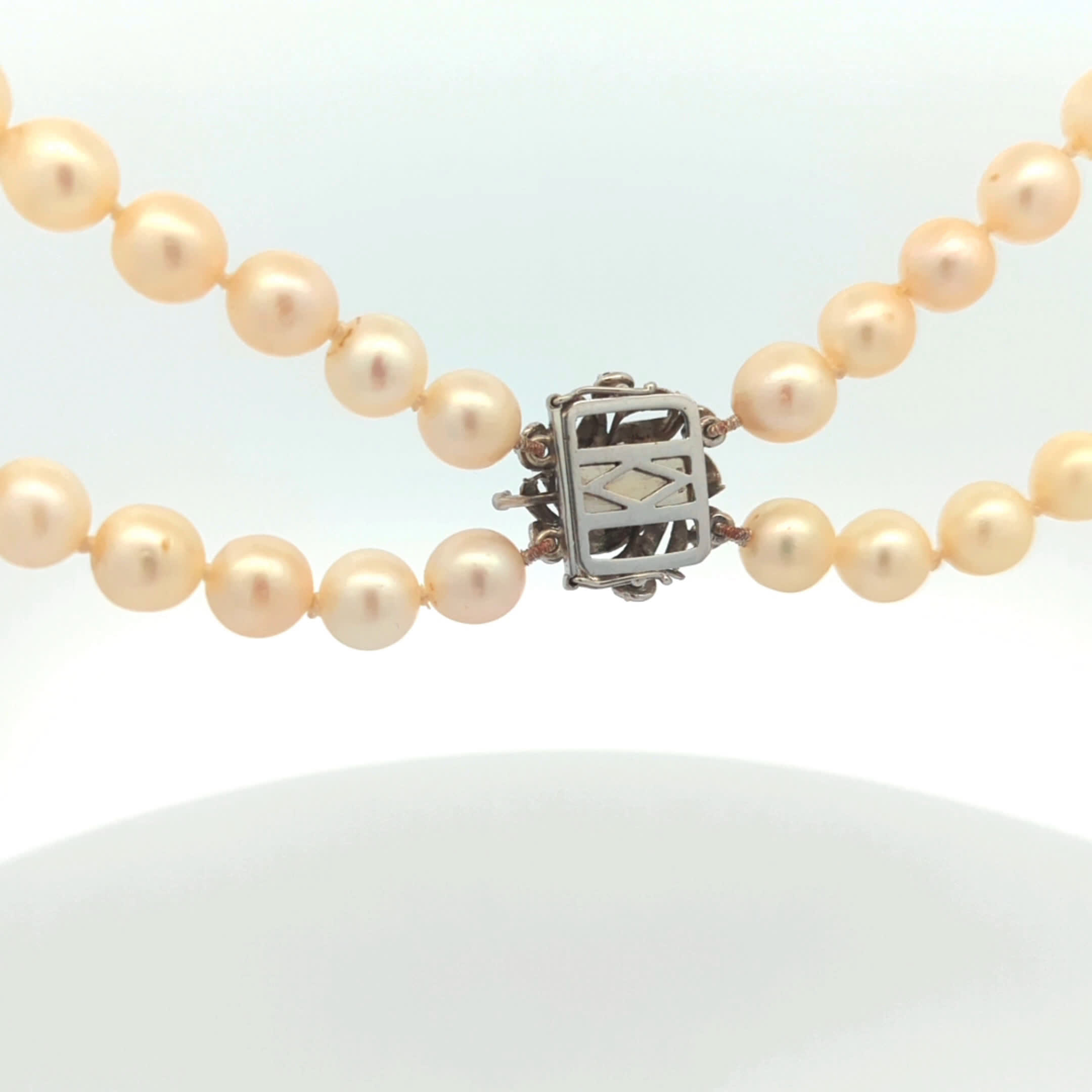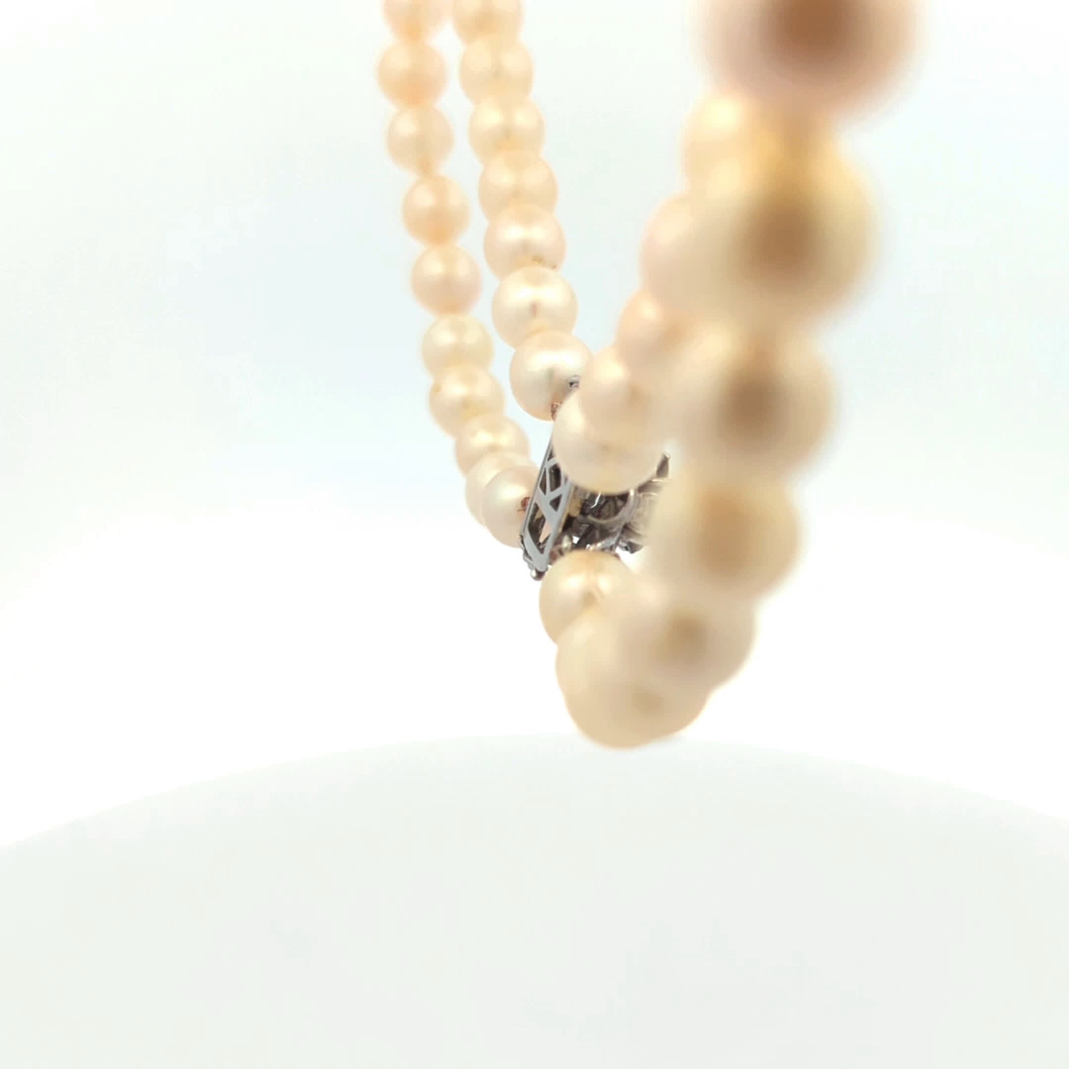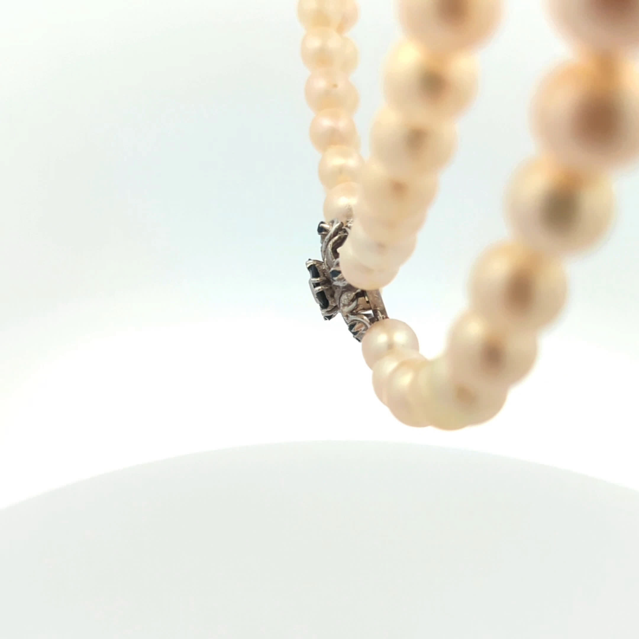 Lassen Sie sich von der zeitlosen Eleganz unserer zweireihigen Perlenkette verzaubern. Diese exquisite Kette besteht aus 71 sorgfältig ausgewählten Perlen mit einem Durchmesser von 7,7 mm bis 8,2 mm, die in zwei Reihen angeordnet sind und einen wunderschönen, harmonischen Look erzeugen. Die raffinierte Schließe aus 585er Weißgold ist ein wahres Highlight, geschmückt mit funkelnden blauen Farbsteinen und einem strahlenden Diamanten, der dem Schmuckstück einen Hauch von Luxus verleiht. Mit einer Länge von 43 cm ist diese Perlenkette perfekt für besondere Anlässe oder um Ihrem Outfit eine elegante Note zu verleihen